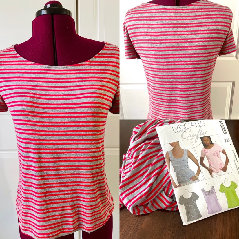 This is one of the simplest t-shirt patterns that I have used. I did not add anything to it but just made the basic t-shirt. It really fits well on me, without any major alternations. The only change is that I shortened the bottom of the shirt by five-eighths inch. This pattern only has three pieces. I utilized the Dritz Stich Witchery to fold the neckline. It added stability as I folded over the knit which helps, keep it from slipping.