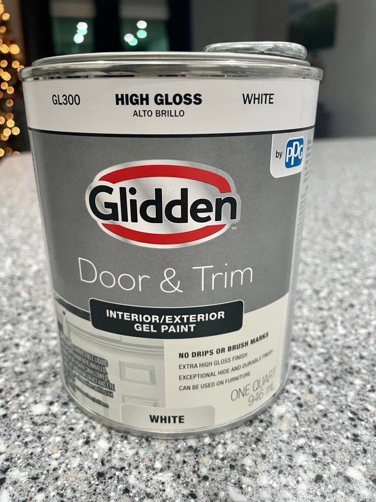 We filled in the screw holes and the space between the wood and quarter round with wood putty and then sanded down the boards. Oh, did that ever make a mess. The last step was to paint the tables. We used the Door & Trim pain from Glidden with High Gloss, and we applied two coats.