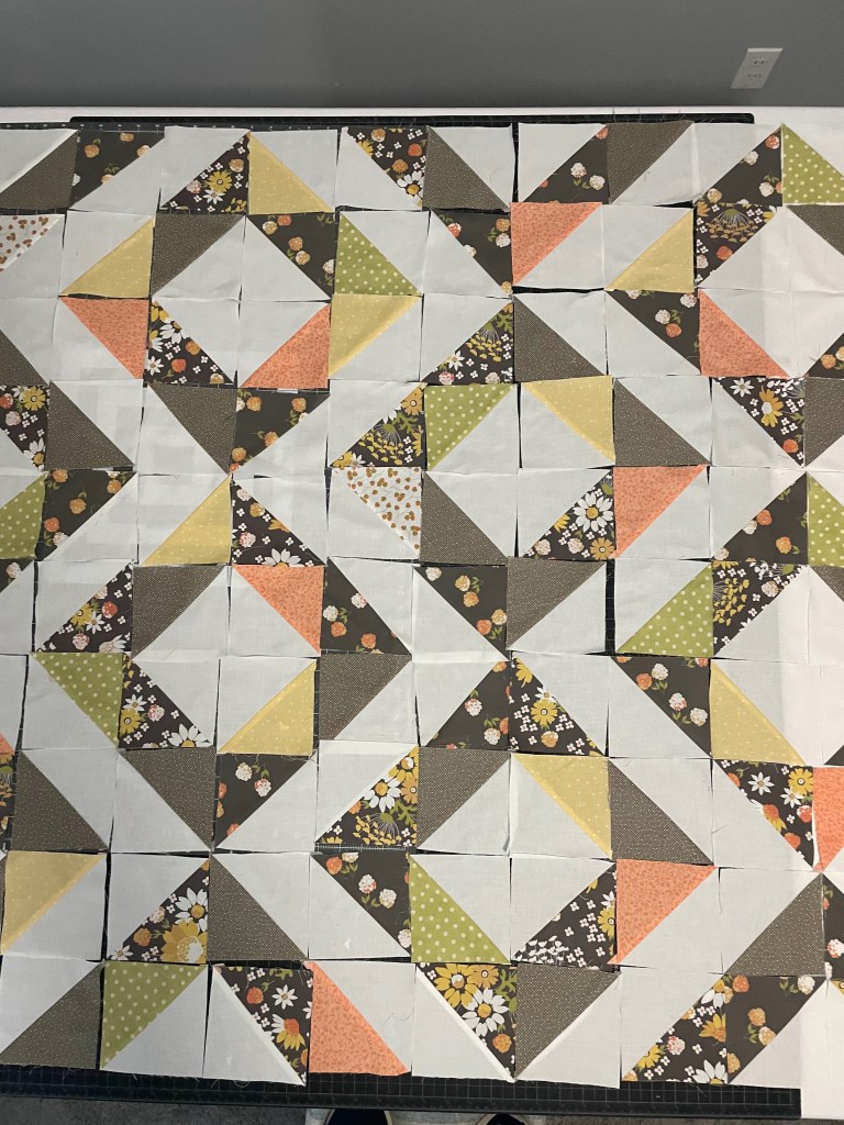 The biggest challenge was laying it out, each diamond had 12 squares. It is a must to lay out the entire quilt before sewing. The pieces were laid out on my cutting table. At times the design stumped me, so I had to pull in the husband. My cat also decided to sit on my squares and started to play with them which caused a few panicky moments.