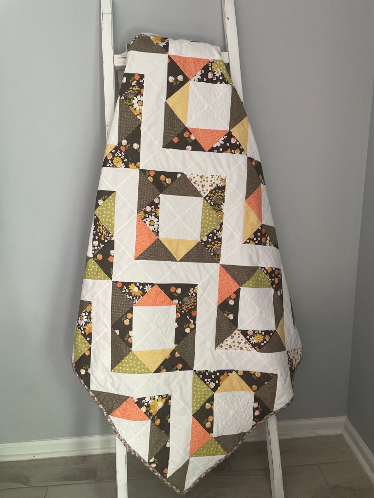 This beautiful quilt pattern was found on Pinterest at sameliasmum.com. The design was fun to put together and the pattern was free, so this was a Win! Win! The solid fabric is white Kona and the floral print fabric was purchased at my local quilting shop, Tilted Quilters.