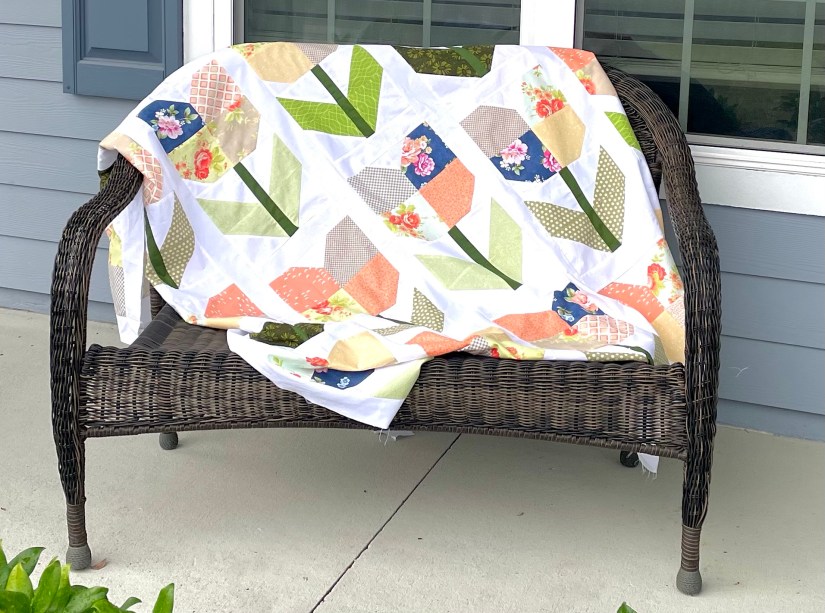 The Totally Tulips design caught my attention because it was a different from what I normally sew, and it just made me smile as I created each tulip. The fabric was from stash, and I utilized Kona white as the background.