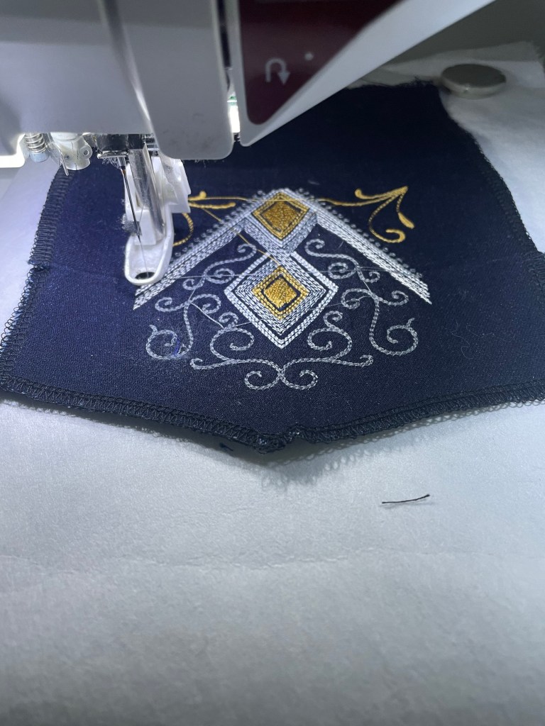 Instead of doing the pockets as per the instructions, I utilized a design from Embroidery Library. The design is called Diamond in the Rough. The design does stitch out beautifully and I had no issues with the machine. Previously embroidered this design for another skirt but I am hoping that the skirt has a better fit and all raw edges are serged.
