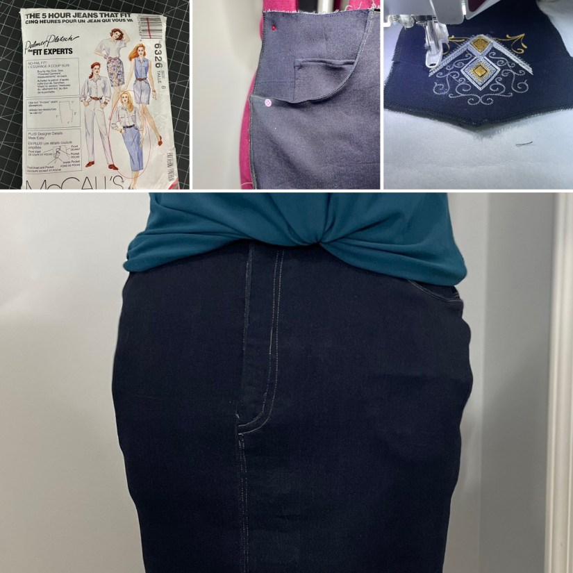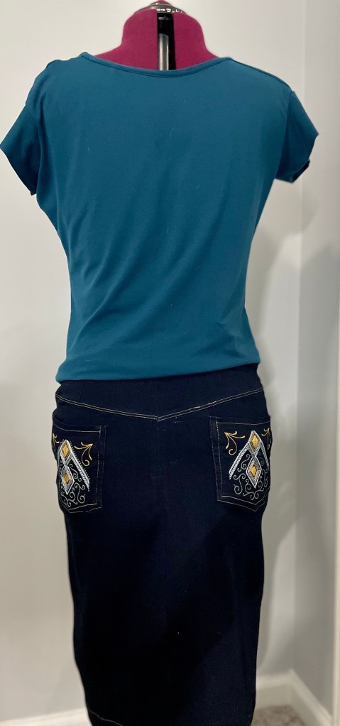 The back of the skirt was fun. I really enjoyed embroidering the back pockets. Here is the picture of how it looks. You will also see again how some of the stitches disappeared in the top stitching across the back of the skirt.