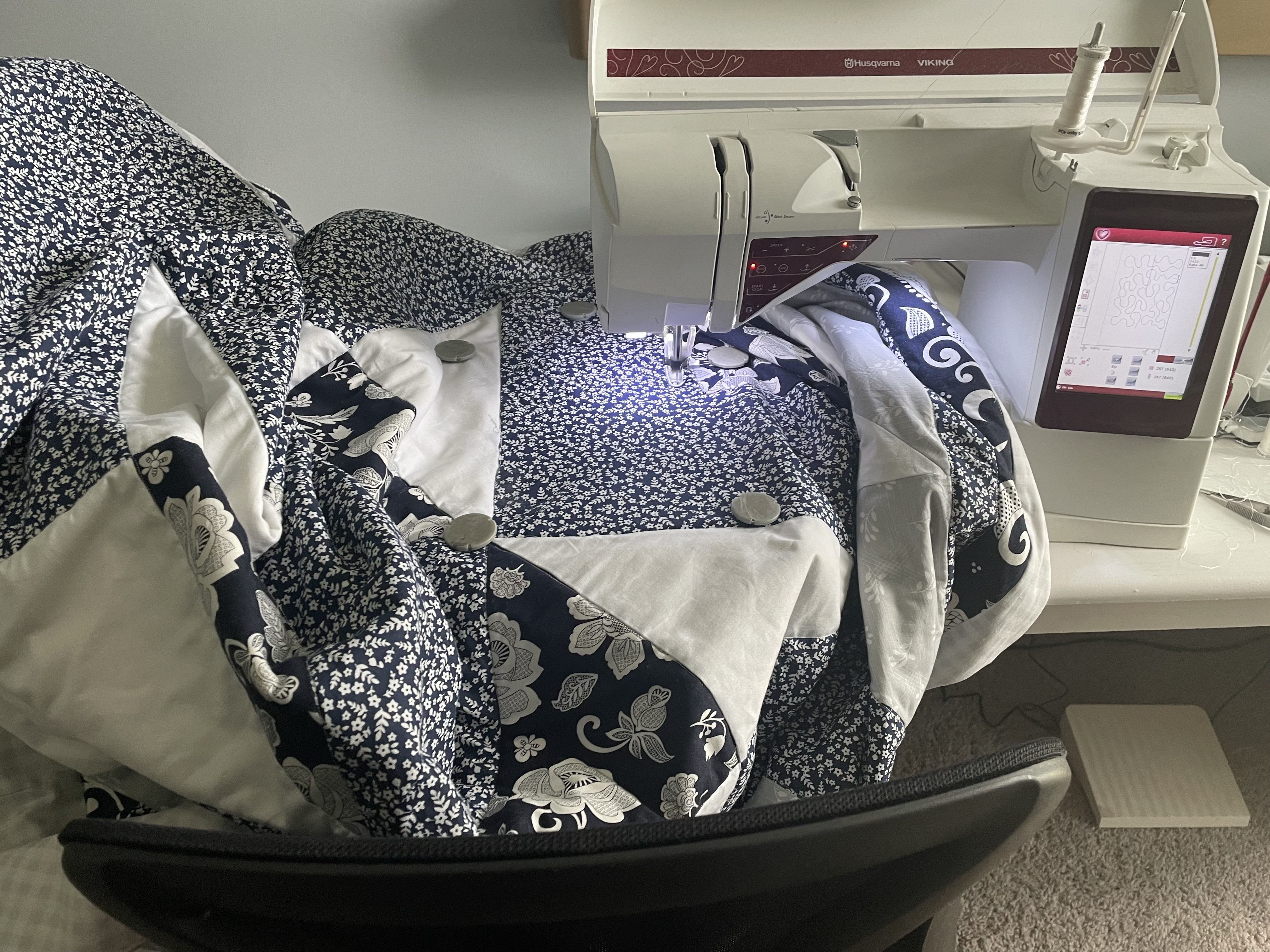 Maneuvering the queen size quilt with a standard size sewing machine, has been challenging. One of the steps that I have taken is to keep the weight of the quilt on the table. If you do not keep the weight up on the table, it can pull on the quilt and distort the stitches. Another method that i have done is roll up one side of the quilt. to help with the maneuvering.