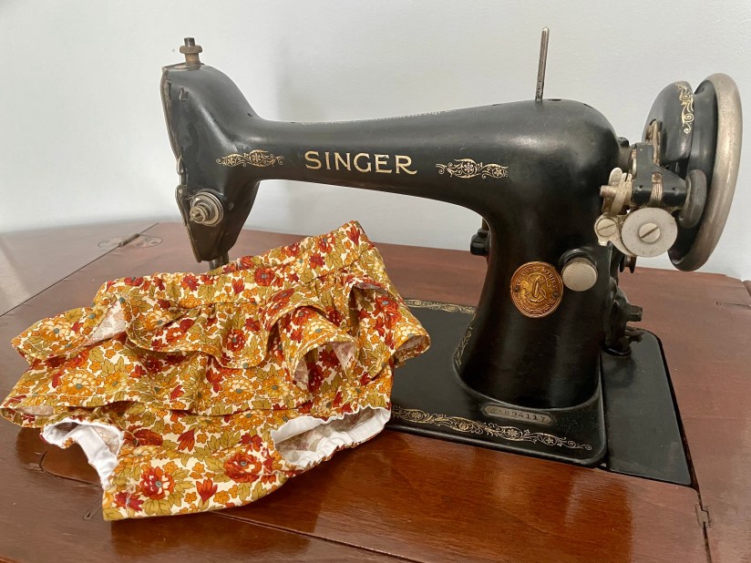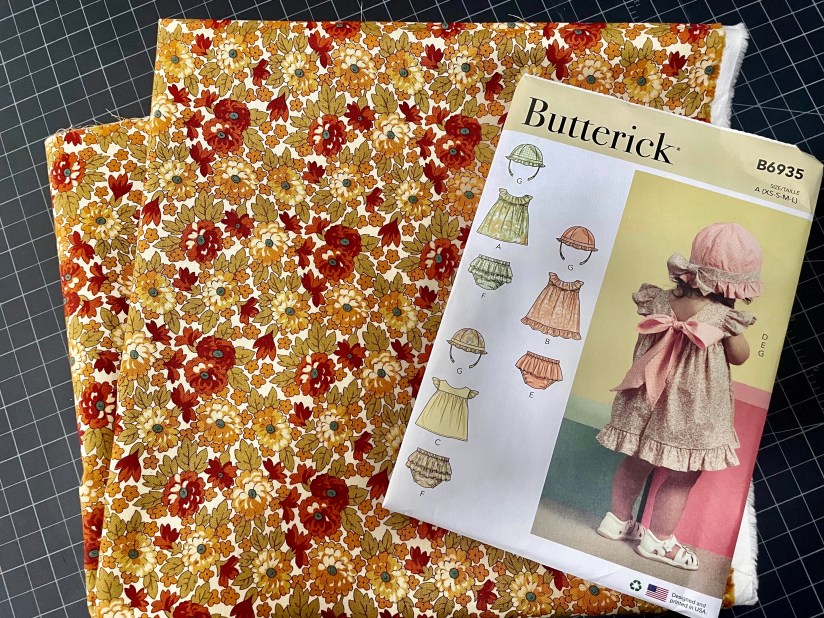 The pattern is from Butterick B6935, of course picked up when JoAnns’s had their pattern sale. The ruffles on the back of the panties was so feminine. The cotton fabric was chosen because of the colors, and it has a retro look. It was something that I had in my stash so there was no cost except for the pattern.