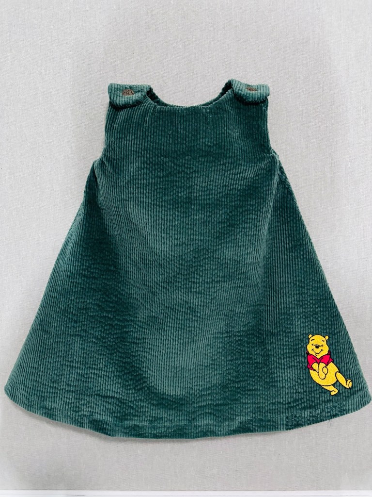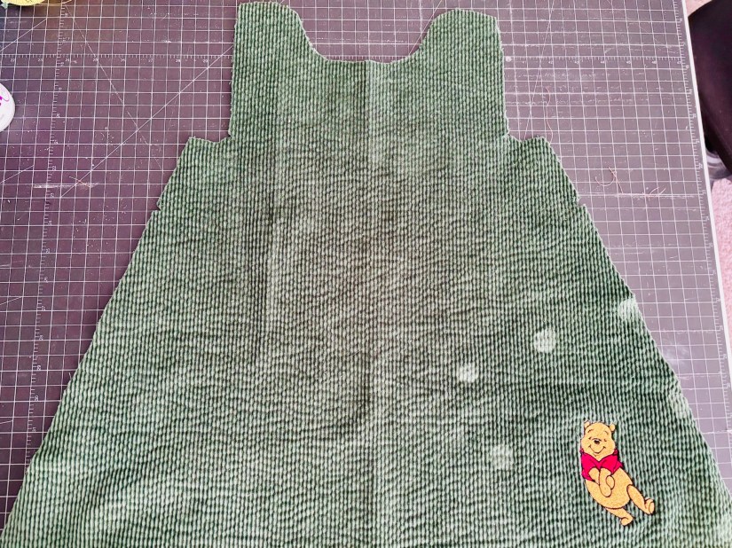 The pattern was a Simplicity S9318 and the fabric from JoAnns. This corduroy jumper was a design than I had in mind to do with adding Winnie the Pooh. Who doesn’t like Winnie the Pooh? The simplicity jumper was not meant for this heavier fabric. It was bulky around the arms but did under stitching and trimming to help reduce the bulk.