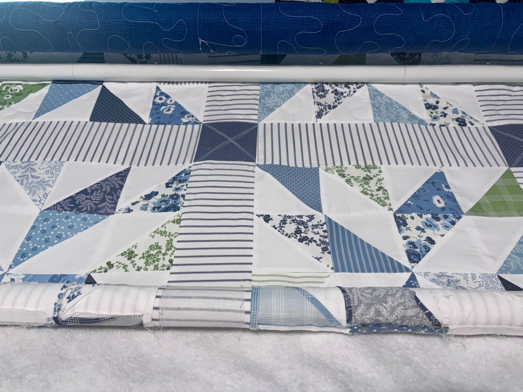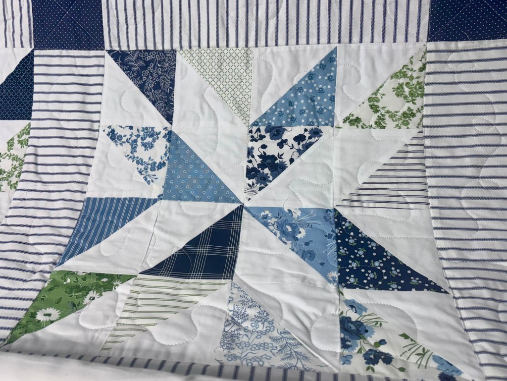 This is my first free motion quilt. It has been a process. The issues have been tension. Staying consistent in the size for free motion. Additionally, the longarm hits a spot in the quilt and would jam up. This happens where several fabrics come together, and the spot is hard.