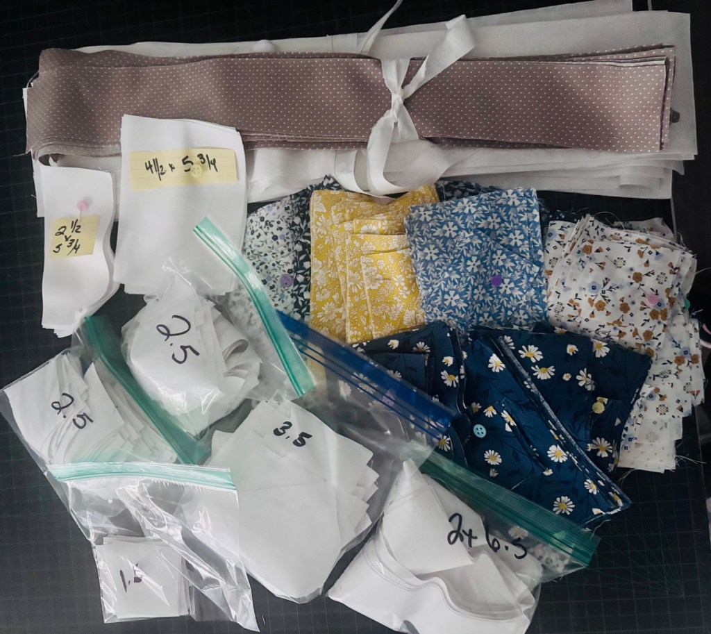 Due to volume, I came up with a plan. Cut the largest pieces first then gradually work down to the smallest. This kept me from wasting fabric and coming to the end and not having enough.
