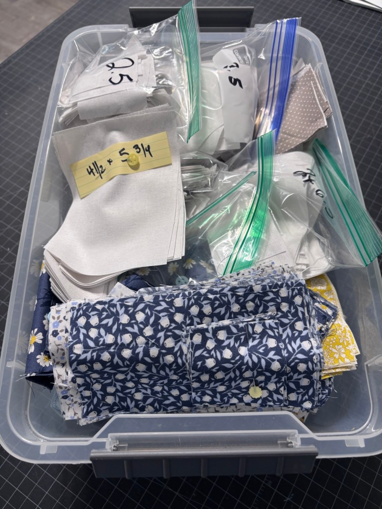 Once all the cuts are done, I put them all in a clear bin to keep everything together. Now everything is ready for me to start sewing.