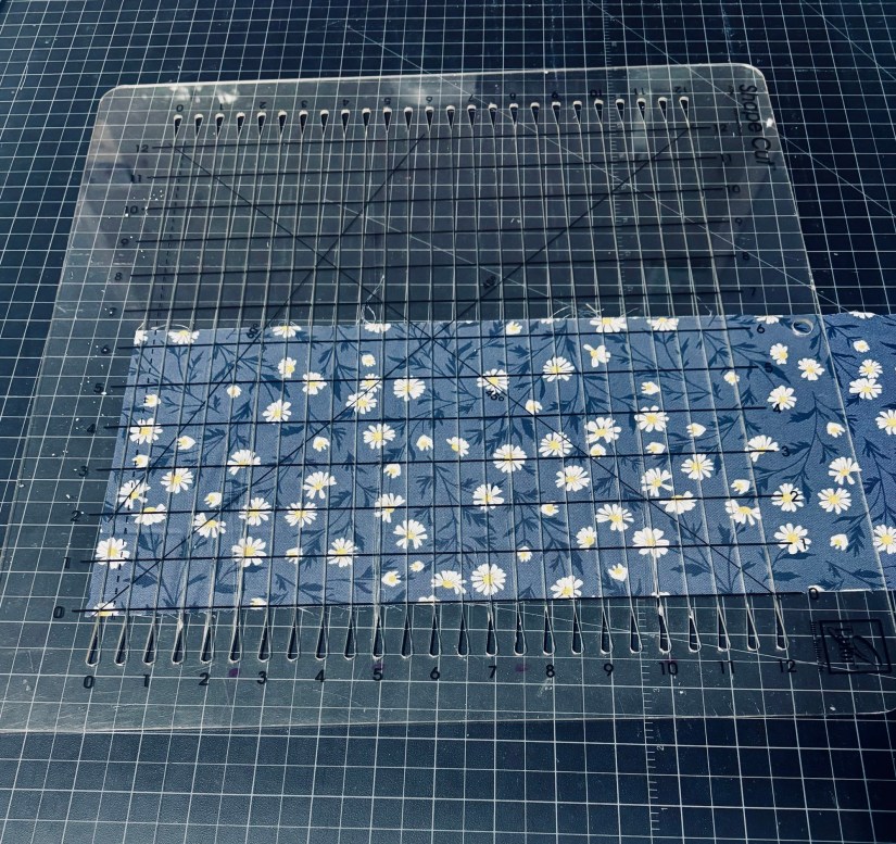The ruler I own is a 12″ x 12″ model by June Tailor, though larger versions are available now. When this one eventually wears out, I’ll definitely upgrade to a bigger size.