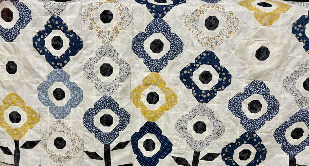 My next step will be quilting it. I already have the backing — a soft blue that should blend perfectly with the blues and yellows in the Primrose.
